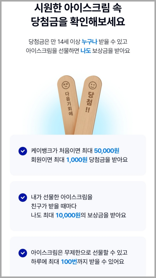 여러분의 여름이 케이뱅크와 함께 더욱 시원하고 풍성해지기를 바랍니다. 행운이 가득한 아이스크림, 지금 바로 뽑아보세요!